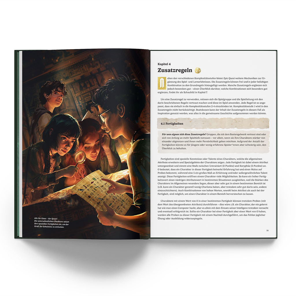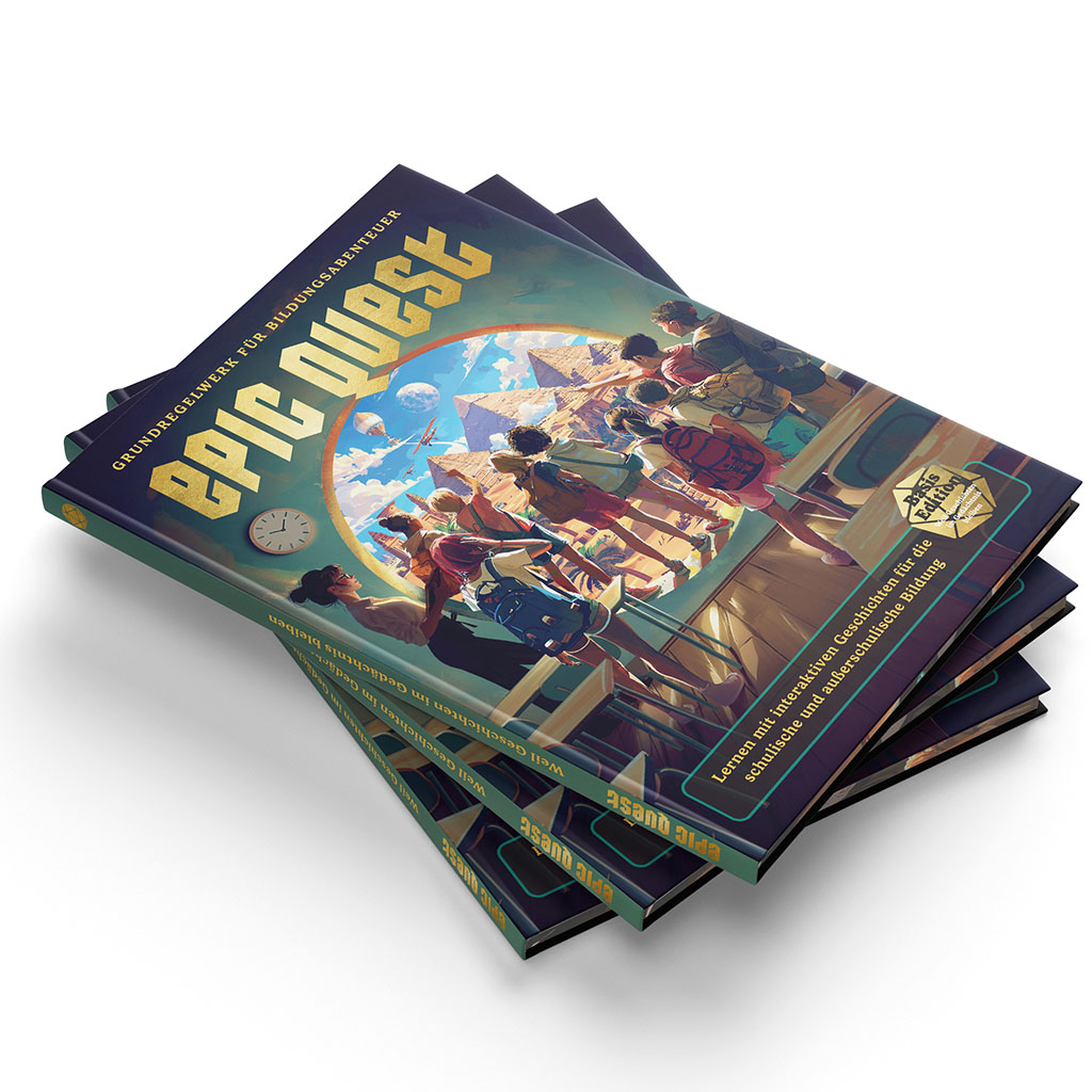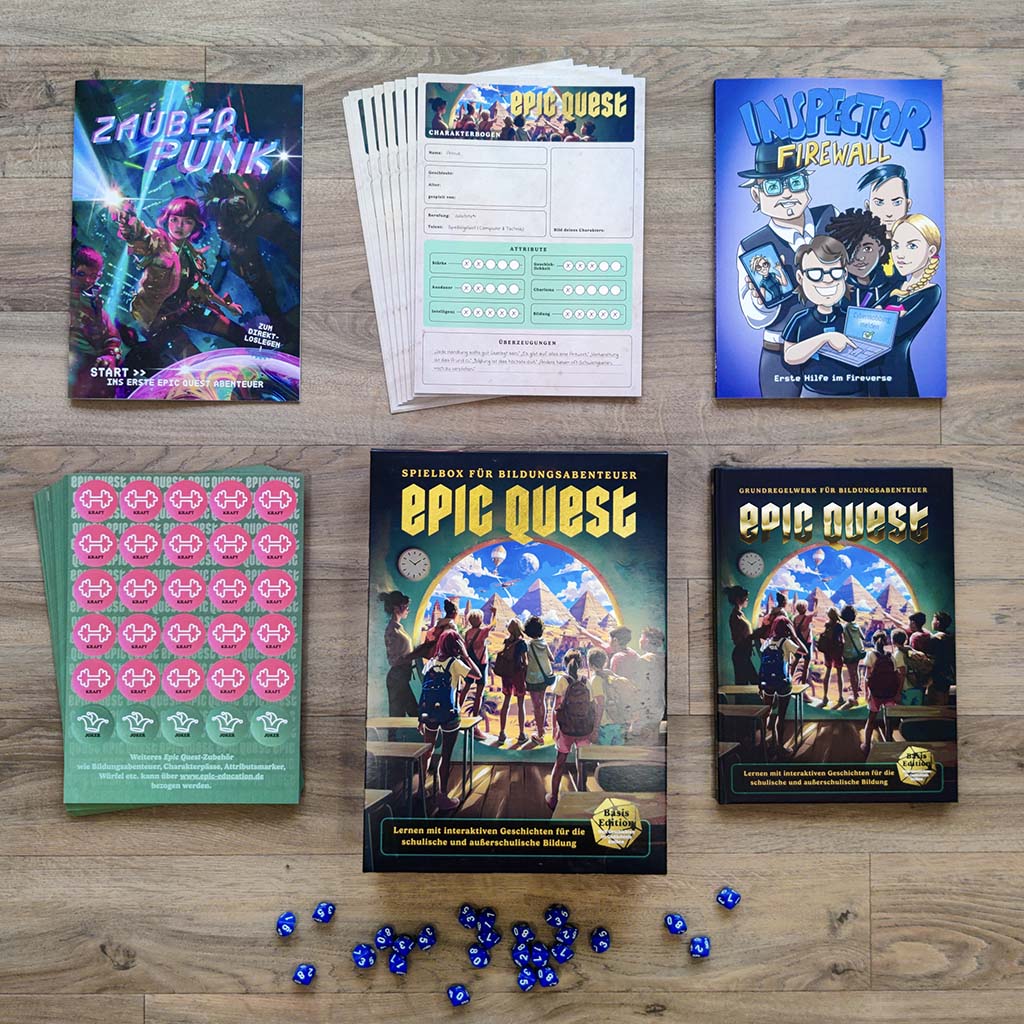 Die Epic Quest Box ist mit 2,8 kg Inhalt in allen Details episch geworden. Die Box und das Regelwerk geben bereits neue Themen vor (der gesamze Fächerkanon der Schulstufen 1 bis 13) und Anknüpfpunkte für Spielerweiterungen.