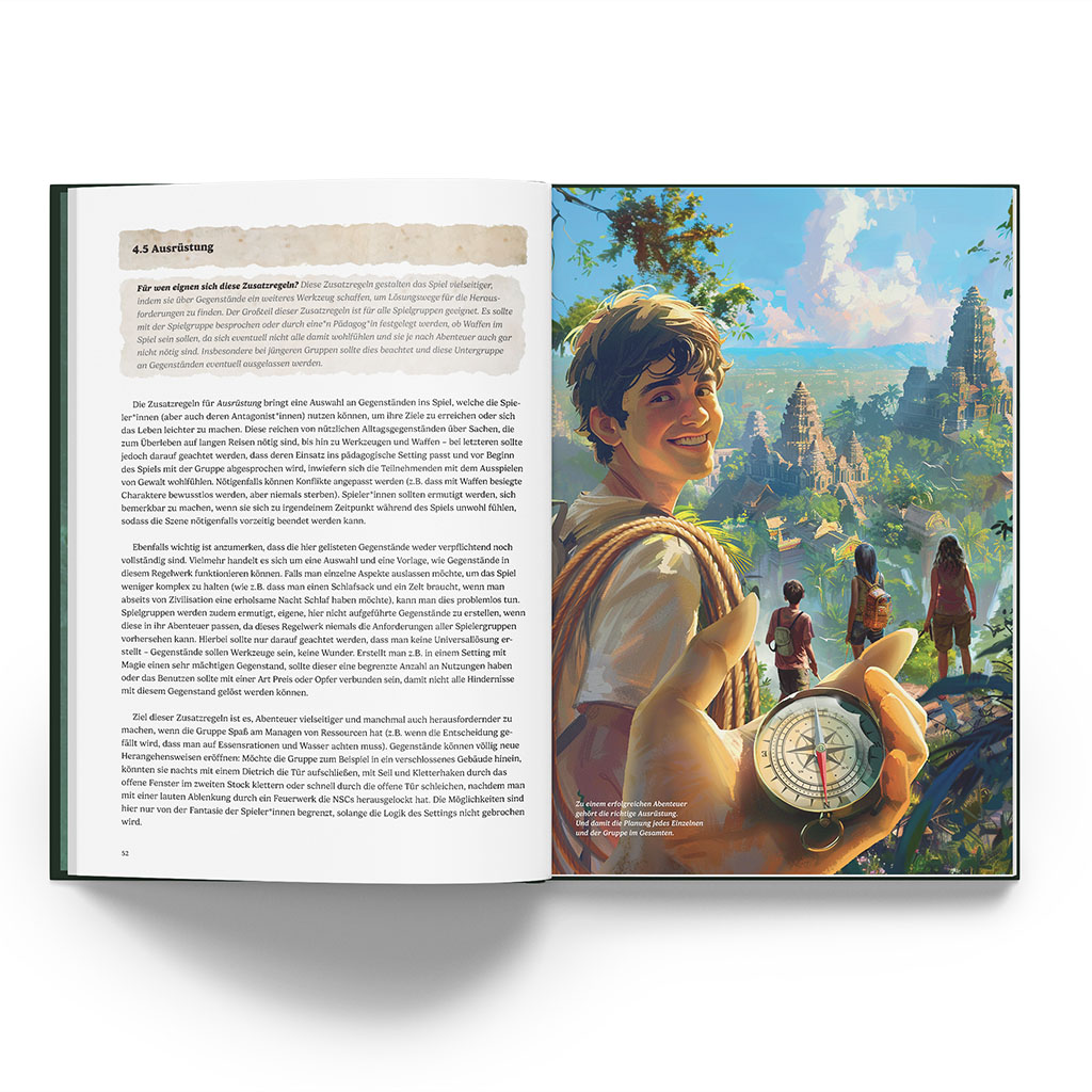 Die epische Box beinhaltet alles, was man für Bildungsabenteuer in Klassen und Teams braucht. Darunter das 100-seitige Grundregelwerk als festen Einband, zwei Abenteuer – eines zum direkten Einstieg, das andere für viele Einsätze und jede Altersstufe, verschiedene vorgefertigte und leere Charakterbögen, Attribute-Sets mit Markern zum Herauslösen – und gaaanz viele Würfel.