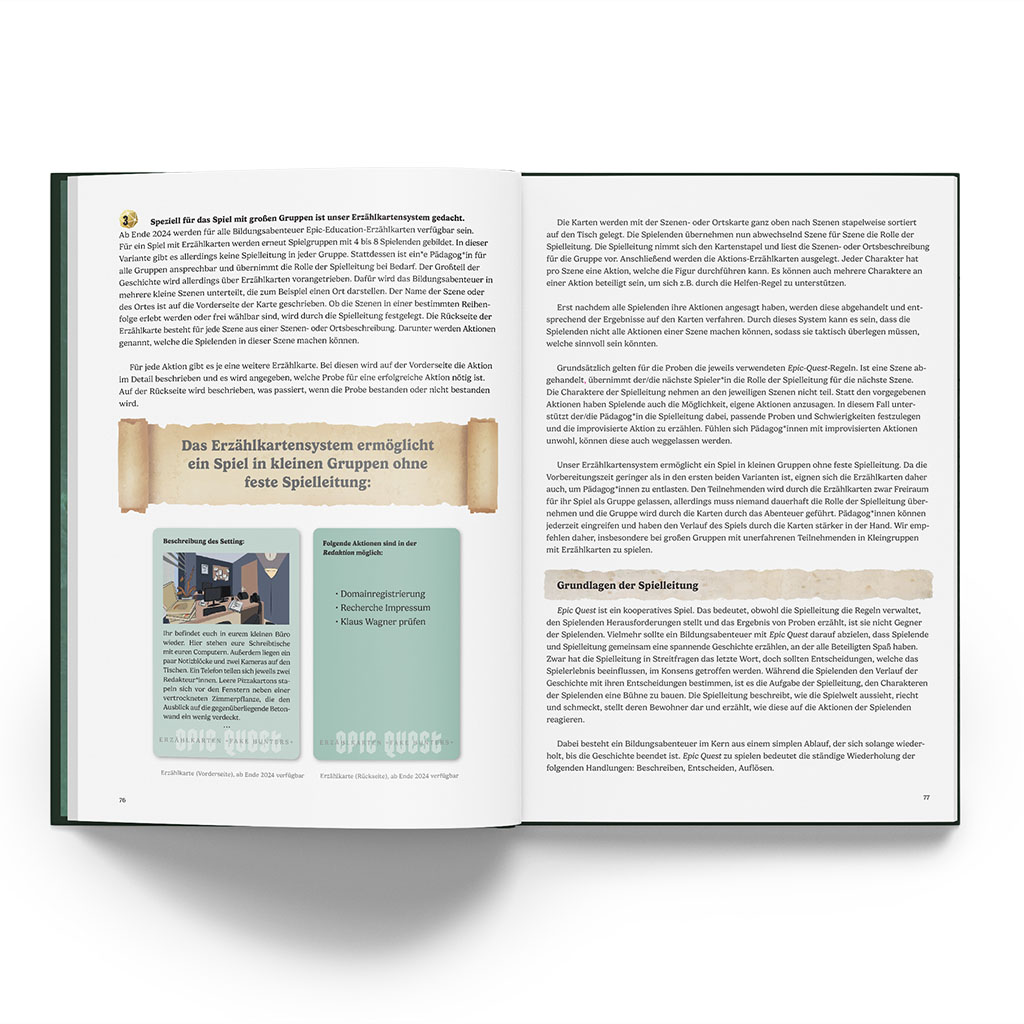 Epic Quest ist eine pädagogische Spielmethodik, entwickelt von der Epic Education gGmbH, einem der führenden Unternehmen bei der Entwicklung narrativer Bildungserlebnisse in Deutschland. Der Gute Gesellschaft Verlag stieg aus Begeisterung als gestaltender Partner vor der Crowdfunding-Phase in das Projekt des Startups ein. Wir entwickelten das Produktkonzept (ergänzend zu den bereits existierenden Epic Workshops), gestalteten und realisierten alle Materialien der Box und konnten auch beim »Storytelling« unsere erzählerische Kompetenz einbringen. Das alles in enger Zusammenarbeit mit dem Epic Team.