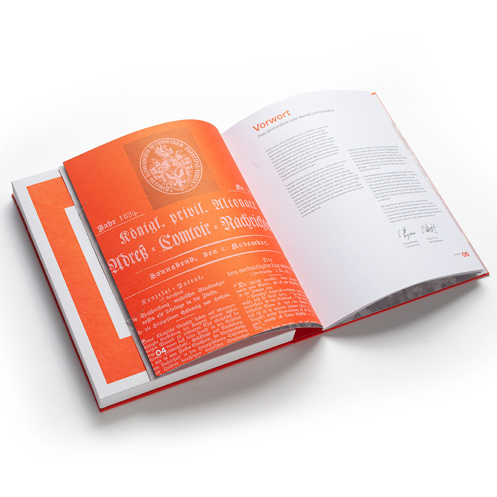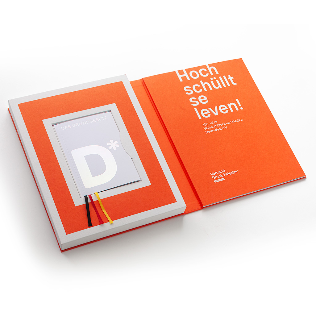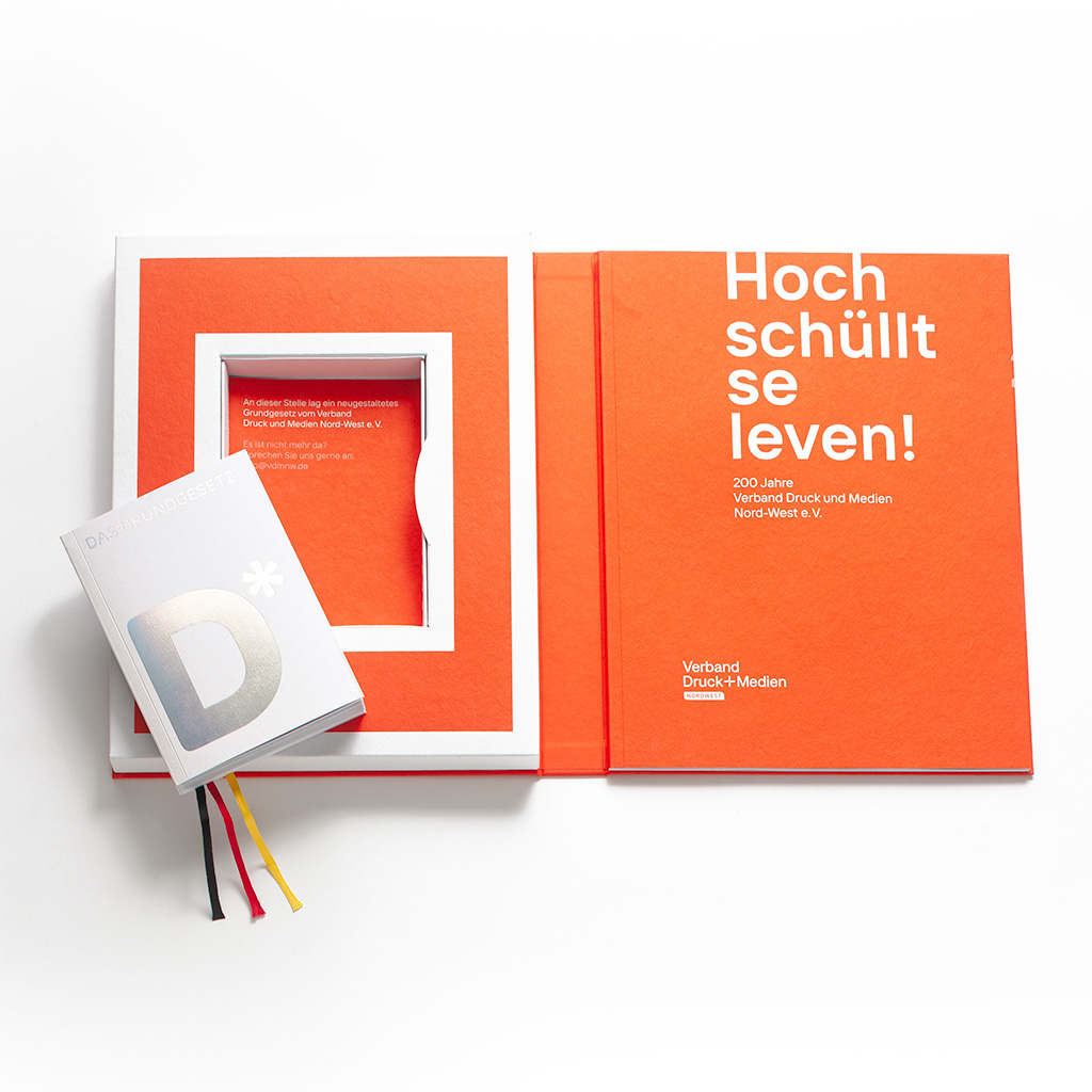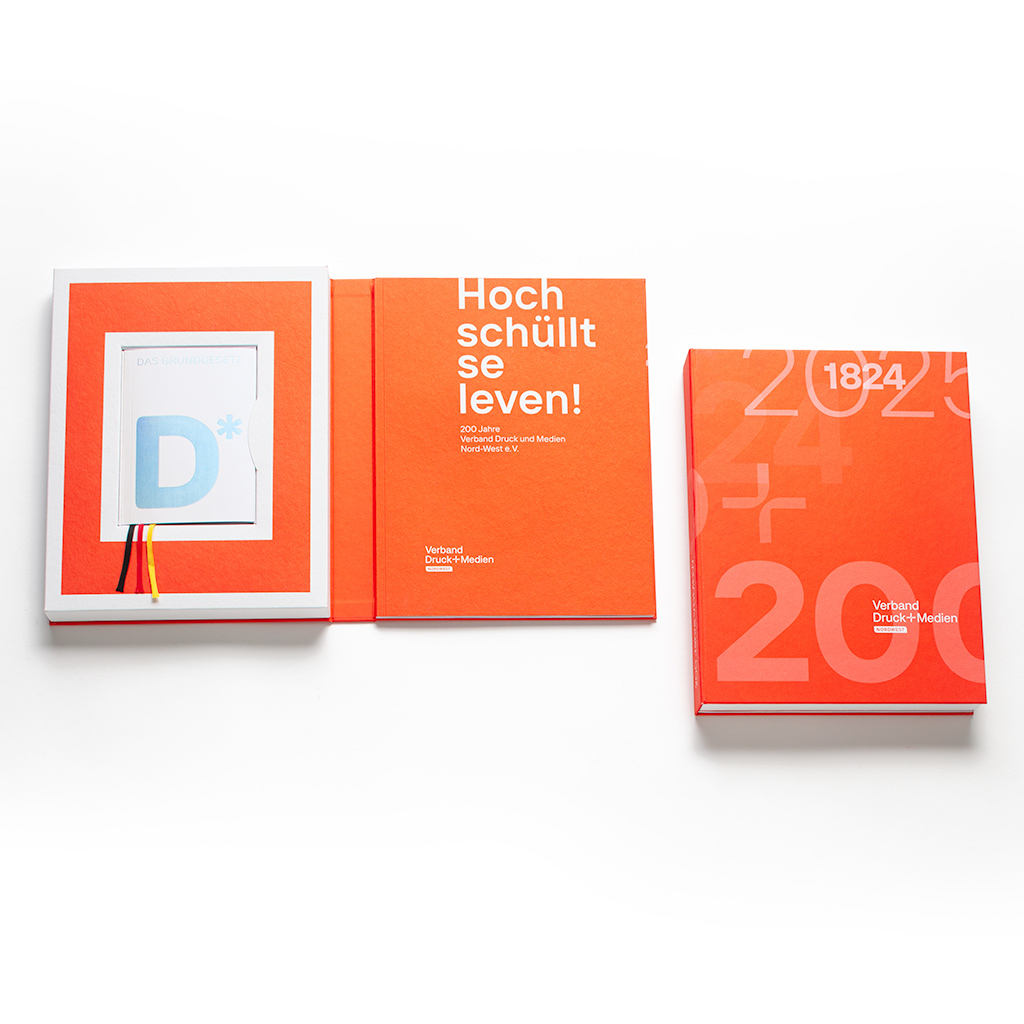 Die Relevanz von gedruckten Medien sind sinn- und existenzstiftend für den des größten aller Landesverbände für Druck und Medien. Statt Anfangs gewünschten Festschrift als Broschüre wird ein ganzes Jubiläumsensemble daraus. Beginnend mit einer Buchschachtel und einem Titel – einem Hochruf in der Mundart des Nordens, genauer gesagt dem Hamburg-Altona des Jahres 1824. In der Schachtel dann auf der rechten Seite die eigentliche Festschrift mit einem Zeitstrahl voller ikonischer Druckprodukte mit gesellschaftlicher Bedeutung. Von einer historischen Zeitungsannonce anlässlich der Gründung aus dem Jahr 1824, Backpulvertütchen von Dr. Oetker (1893), Flugblättern der Weißen Rose (1933-45) dem ersten Micky-Maus-Heft (1951), hin zum ersten 3D-gedruckem Haus (2021) und den Verbandsfeierlichkeit im Jahre 2025.