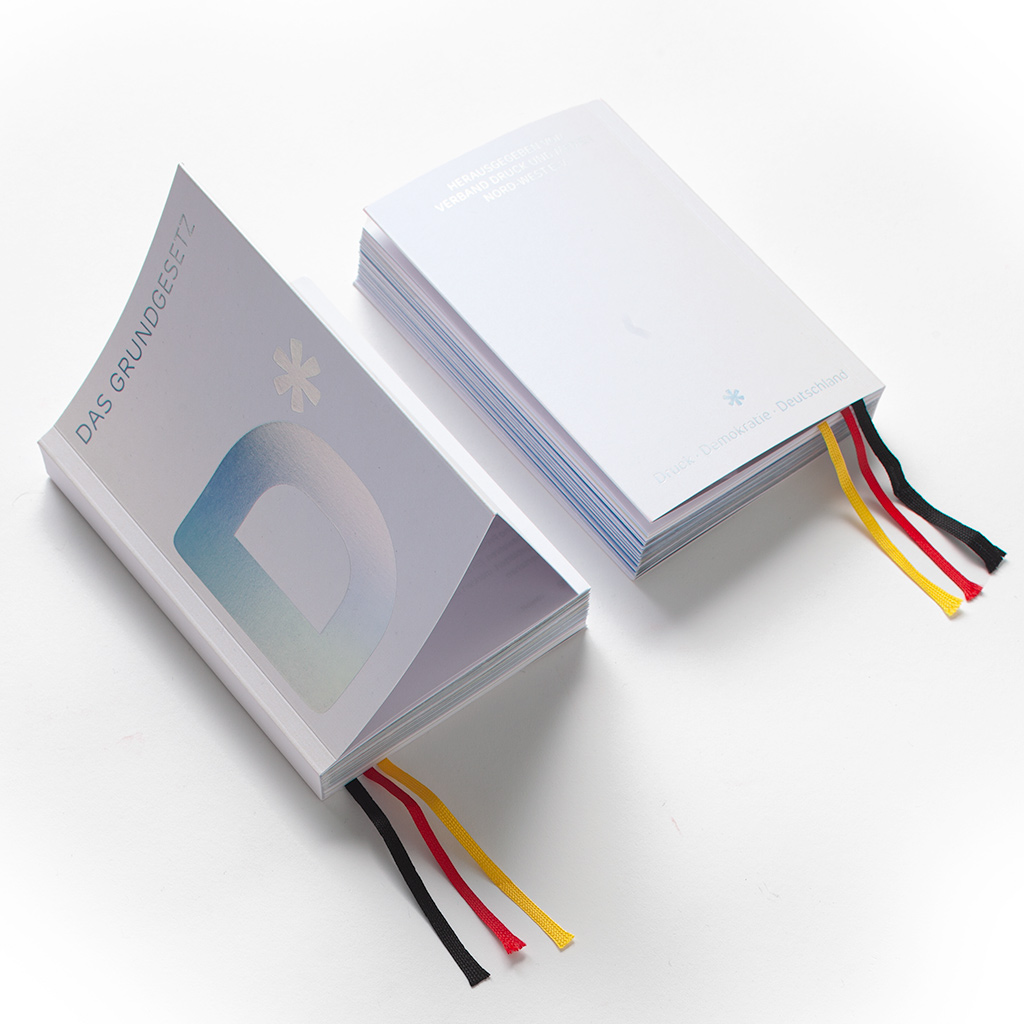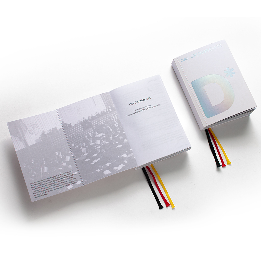 Auf der linken Seite das eigentliche Herzstück – ein neu gestaltetes Deutsches Grundgesetz. Mit den 19 Artikeln der Grundrechte, visualisiert in emotionalen Fotomotiven zum Auffalten in Panoramaformat. Die Würde, die Freiheit, das Asyl und 16 weitere Rechtsansprüche werden damit nahbar und warmherzig dargestellt. Alles gedruckt auf feinem Design- und Naturpapieren der Papierfabrik Gmund. Veredelt mit Sonderfarben, Kaltfolienprägung, Stichfadenheftung, Klapperumschlag und dreifarbigen Lesebändchen in den Nationalfarben.
