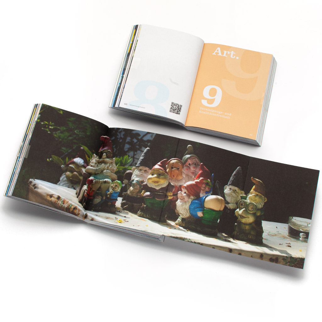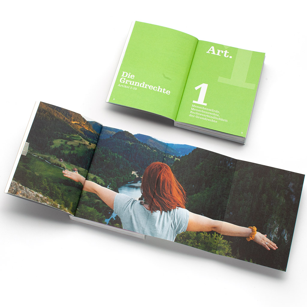 Aber unser Grundgesetz verdient einen attraktiveren und kraftvolleren Auftritt. Dieses handliche und wirklich heiße Grundgesetz hat Demokratie-Freunden eine Menge zu bieten. Im neuen Design, mit schimmernder Holo-Optik, werden die 19 Grundrechte plus drei Zusatzartikel bebildert. Das Zick-Zack-Format zeigt das Lebensgefühl des jeweiligen Artikels in voller Breite und Pracht. Die Motive variieren an der einen oder anderen Stelle in Bezug zur Version #1.